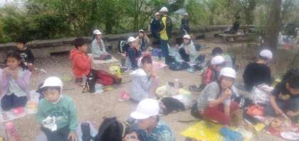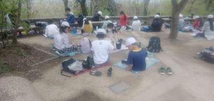 ようやく頂上に到着。グループごとにお弁当を食べます。