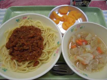 今日の献立は、スパゲティミートソース・白いんげん豆のスープ・みかん缶・牛乳です。1年生の給食が始まって3日目、みんなの大好きなスパゲティミートソースにしました。
