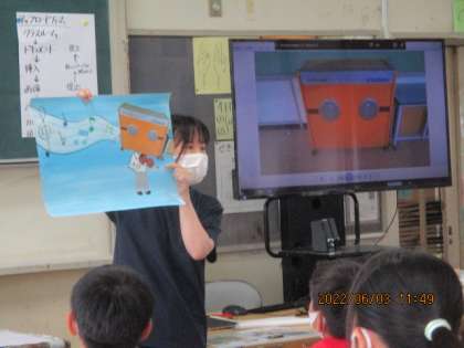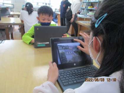 5年生の図工の授業を参観しました。「『そのばくん』登場」という題材を聞いて、どんな作品を作るのか興味津々でした。身近にあるものや場所で「顔」に見えるところを学習用端末のカメラ機能で撮影し、その写真を使ってイメージを膨らませ、体や背景、持っているものなどを考えて描いていきます。学習用端末をもって学校中を回ってみると、子どもたちはいろいろな場所で「顔」に見えるところを発見して撮影していました。普段見慣れた場所でも、よく見ると、人間の顔に見えてくる場所があるものですね。子どもたちと一緒に撮影を楽しみました。これからどんな絵に仕上げていくのか楽しみです。
