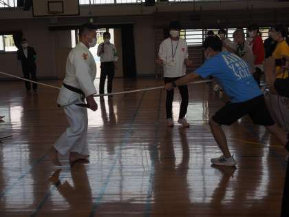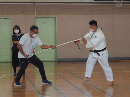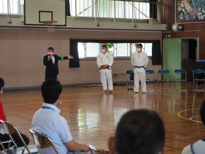 今日は高尾警察署の方を講師とした不審者への対応について学び合いました。そして、「さすまた」を使って不審者に対応する訓練を中心に行いました。刃物をもった不審者が襲ってきたとき、まずは、距離をとること、そして、不審者に対して使えばいいのかについて実際にシミュレーションしながら教えていただきました。