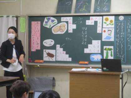 1年生の国語の授業を参観しました。「ことばをつなごう」では、ひらがなのカードをつなげて言葉作りをしていました。挿絵を手掛かりにしながら、言葉をつなげ、意味のある言葉のまとまりを作っていきます。