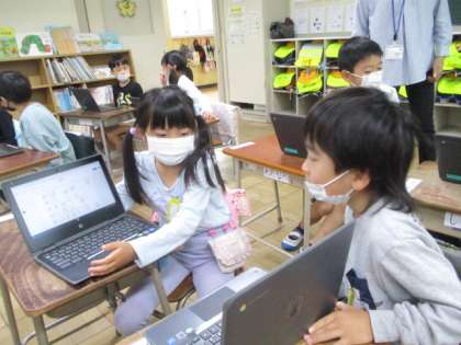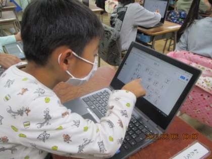 学習用端末を使って、パズルに言葉を当てはめながら、楽しく学習する姿がありました。今回はジャムボードの機能を使って学習していましたが、1年生の子供たちが、自由自在に言葉のカードを動かしたり、自分で書いてカードを作ったりする様子には驚かされました。できた言葉を、お友達に紹介し合う姿もかわいらしかったです。「一文字代わると、違う言葉ができるんだね」子どもたちは文字カードをつなげる学習を通して、身近なものを表す言葉に興味を持つことができました。