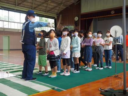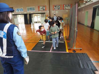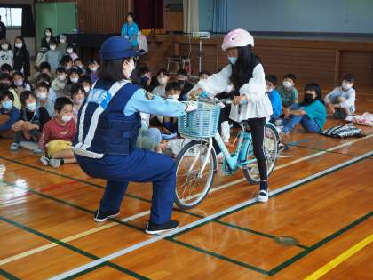 実技研修では、体育館に作った交差点のコース上を使って行いました。感染症予防の観点から、今年も警察署の方の模範演技を見せていただき、代表児童が体験するという形をとりました。