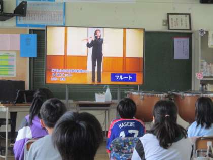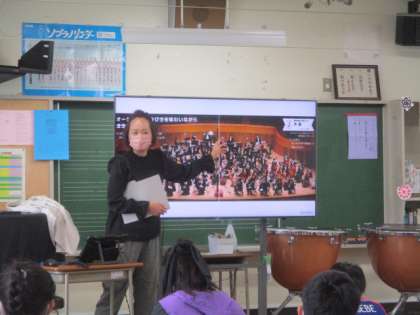 6年生の音楽の授業を参観しました。人気のアップテンポな曲でウォーミングアップしてから、今日の学習であるオーケストラの演奏の鑑賞をしました。1回目の鑑賞で、どんな音色が聞こえたかを発表し合った後、これまでに学習したいろいろな楽器について復習をしました。代表的な楽器の音色を聞いた後、オーケストラの構成について考えました。学習用端末を使い、音色や音の大きさなどを考えながら、自分たちで楽器の配置を考え伝え合いました。それから、実際のオーケストラの写真から、構成を確かめてから、もう一度鑑賞に取り組みました。最初に聞いていた時と、構成が分かってから聞くのとでは、聞こえてくる楽器の種類や音の重なり、音色の特徴などさらに深く理解できたようです。
