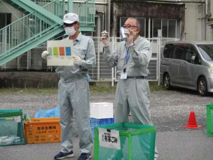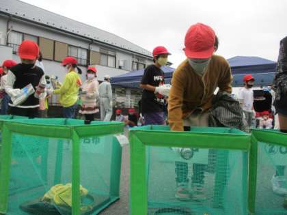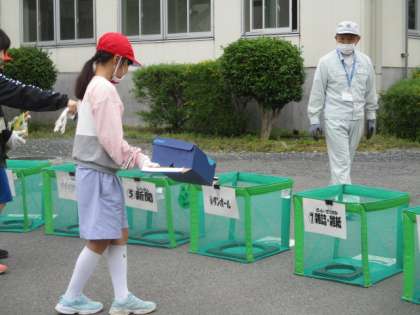 子どもたちが身近にあるもののごみを分別しながら捨てる活動では、すぐに分別できるごみと、悩みこんでしまうゴミもあり、分別のかごの前でじっと考え込む姿もありました。先生たちもチャレンジしましたが、先生たちも考え込む場面もありました。最後に答え合わせでは、分別の仕方だけでなく、分別したり、リサイクルできるものはリサイクルゴミに入れるだけで、ずいぶん燃やせるゴミが減ることもわかりました。子どもたちはこの学習を通して、ごみの分別やリサイクルについてたくさんのことを学ぶことができました。