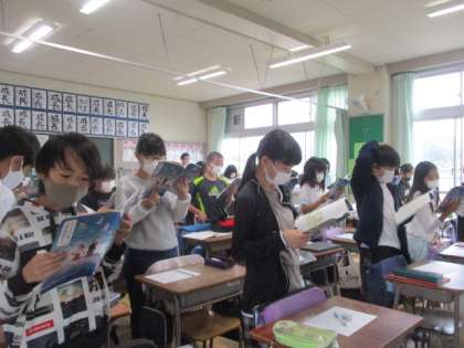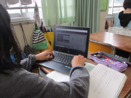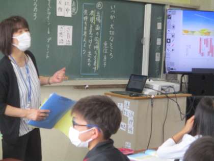 6年生の国語の授業を参観しました。比喩や擬態語、対比など工夫のある表現方法を手掛かりに、主人公の心情を読み取る学習に取り組みました。最初は「うれしい」「かなしい」といった直接的な感情表現に目が向いていた子どもたちも、読みを深めているうちに、「『顔を上げて』っていうところが、前向きな主人公の気持ちが表われていると思う」「『一筋の飛行機雲』は、明るい未来に向かって進んでいるということを表しているような気がする」といった読み取りを進めていく姿がありました。考えの共有は、ムーブノートを使って行いました。友達の考えに共感し、「拍手マーク」を送っていました。こうして友達の考えに触れ、自分の読みを深めています。