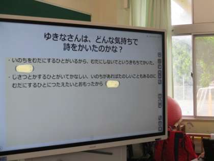 高学年グループでは、児童朝会でも紹介した院内学級に入信していた子供の詩を使って、生と死について考えるところから始まり、「命を無駄にすること」という言葉の意味について考えを交流しました。「いのちは一つしかないから、無駄にしちゃいけない」「自分の命も周りの人の命も大切」など、この詩を通して考える姿がみられました。