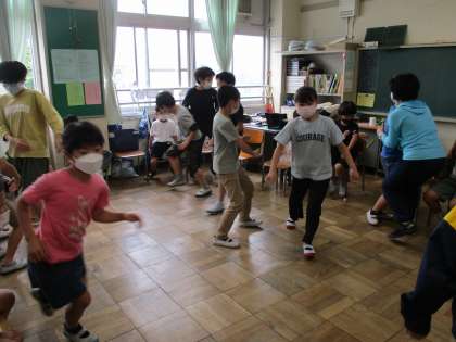 教室では、何でもバスケットやリーダー探し、爆弾ゲームなどで遊んでいました。6年生が上手にリードして盛り上げている様子がみられました。