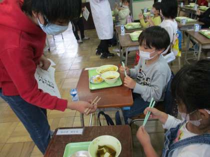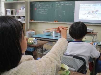 食育の一環として、正しいお箸の使い方を学ぶ「めざせ!おはし名人」に取り組んでいます。今日は給食の時間を使って給食委員会の子供たちが全学級を回って正しいおはしの使い方の指導をしてくれました。映像資料を使って持ち方やおはし使いのマナーなどを教えてくれるだけでなく、1年生の教室では一人一人のおはしの持ち方を見ながら優しく教えてくれる姿もありました。