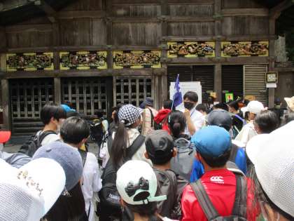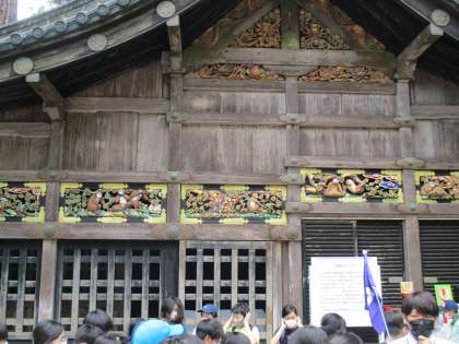 三猿の彫刻の説明を聞きます。8面ある彫刻は人の一生を表しています。