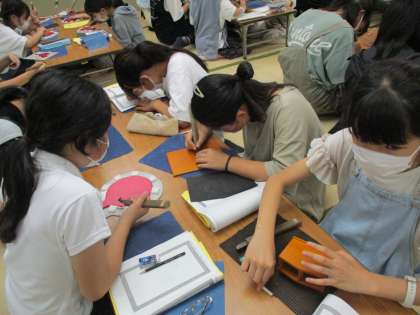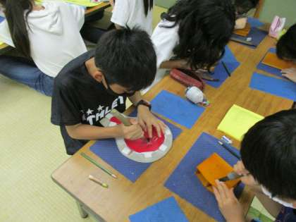 慣れないひっかき刀での彫刻に苦戦していましたが、自分オリジナルのデザインを楽しく描いていました。