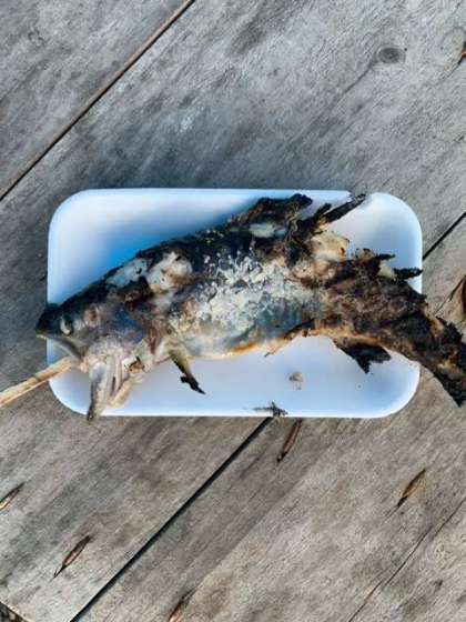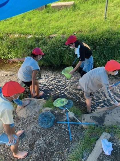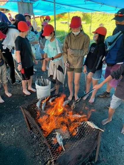 魚つかみ体験では、川に放流されたヤマメを手づかみまたはアミで取り、その場で捌いてもらって、焼いて食べます。いのちをいただくことを意識しながら活動を行いました。