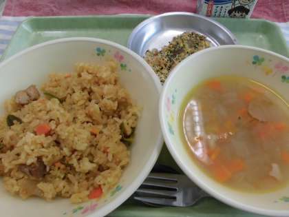 今日の献立は、マクブース風まぜごはん・あじの香草パン粉焼き・レンズ豆のスープ・牛乳です。サッカーワールドカップが開催されます。給食でも対戦国のメニューを食べて応援するという取り組みをします。今日は、開催国のカタールにちなんだ料理です。