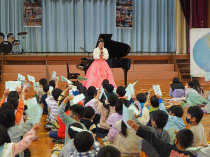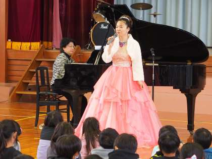 今年も文化芸術による子供の育成事業の一環として、平井李枝先生、平井彰子先生によるコンサートを実施しました。初回は1・2年生です。1年生は平井先生と初対面ですが、平井先生がドレスで登場すると、「素敵!」「かわいい!」「きれい!」という声が。これから始まるコンサートに心を躍らせる姿がありました。