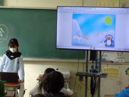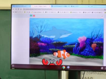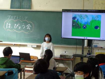 前回の出前授業で、キャラクターに音楽を付けてダンスをさせるというプログラミングを作成したのですが、今回はその発表会でした。