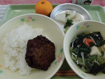 今日の献立は、ごはん・いわしのさつま揚げ・青菜と豆腐のすまし汁・かぶのかつお風味・みかん・牛乳です。今日は、だしで味わう和風の日です。だしの味がよくわかるようにシンプルなすまし汁にしました。