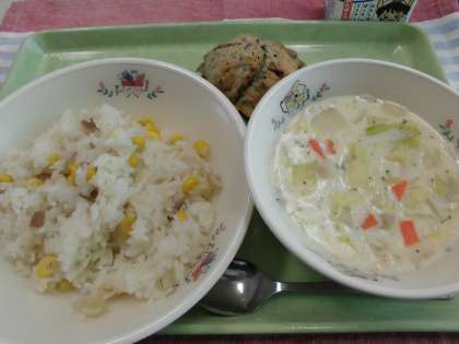 今日の献立は、コーンライス・クリームスープ・八王子米っこカップケーキ・牛乳です。今日は、八王子産の米粉を使って、黒ごまの入ったカップケーキを焼きました。