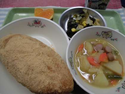 今日の献立は、きなこ揚げパン・野菜と豆のポトフ・わかめサラダ・紅マドンナ・牛乳です。今日は、八王子産のじゃがいも・にんじん・キャベツと白インゲン豆の入ったポトフを作りました。くだものは、愛媛産の紅マドンナというオレンジです。甘くてゼリーのようにつるんとした食感です。