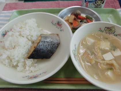 今日の献立は、むぎごはん・さごちのオリーブオイル焼き・いもたこ・そうめんのみそ汁・牛乳です。今日は,香川県の和み献立です。さごちに酒・塩・しょうゆ・レモン汁・オリーブ油で味付けして焼きました。いもたこは、香川県の郷土料理でたこと里芋の煮物です。小豆島産のそうめんをみそ汁に入れました。
