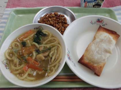 今日の献立は、カレー南蛮うどん・ツナポテトぎょうざ・豆ナッツ黒糖・牛乳です。野菜がたっぷり入ったカレー南蛮は、寒い日にぴったりです。
