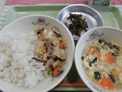 今日の献立は、麦ごはん・厚揚げと豚肉のみそ炒め・茎わかめのごまがらめ・にら玉汁・牛乳です。今日の主菜は、厚揚げと豚肉を人参・たけのこ・干ししいたけ・キャベツと一緒に炒め、砂糖・酒・しょうゆ・赤みそ・豆板醤・ごま油で味付けしました。今週1週間は、おはし名人になろう!ウィークの取り組みをします。