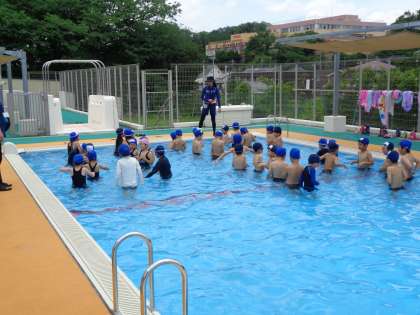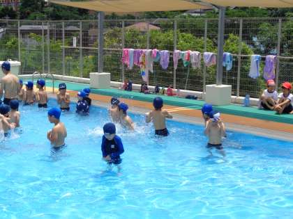 今日は、朝は曇っていたのですが、午前中から日差しが回復し、気温も水温も上昇したため、1年生が第一号でプールに入ることができました。
