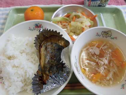 今日の献立は、ごはん・さごちのみそマヨ焼き・キャベツのしょうが風味・くずきりのすまし汁・冷凍みかん・牛乳です。おはし名人になろうウィーク最終日は、「きりさく」です。魚をおはしで切りさいて一口大にし、口元に運べるように練習します。