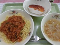 今日の献立は、秋なすのスパゲティミートソース・キャベツのスープ・ヨーグルトケーキ...