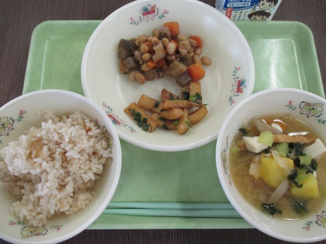八王子ショウガごはん・いかの香り炒め・五目煮豆・さつまいものみそ汁・牛乳