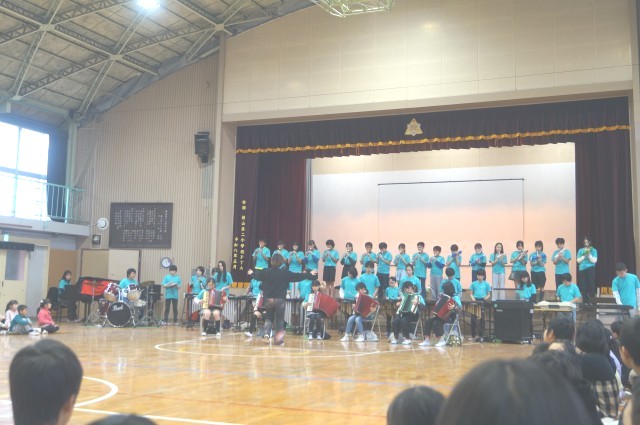 今日は全校児童が体育館に集まり、6年生を送る会を行いました。計画委員会の司会のもと、1~5年生が6年生に感謝の気持ちを伝えました。