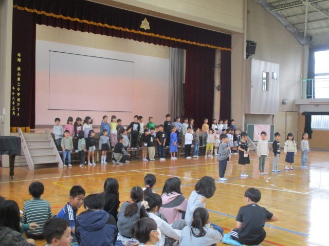 花のアーチを6年生と手をつないでくぐってくる1年生も迎える2~6年生も