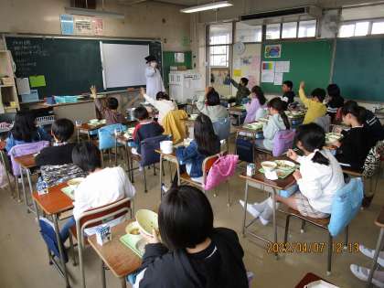 手洗いや消毒の徹底とともに、不要な話はしないで、全員同じ方向を向いて喫食するなどの新型コロナウィルス感染対策をとっての給食です。みんな、新年度初めての給食に期待を膨らませながら配膳を待ち、食事が始まるとモリモリ食べていました。おかわりジャンケンでは、たくさんの子供の手が挙がっていました。
