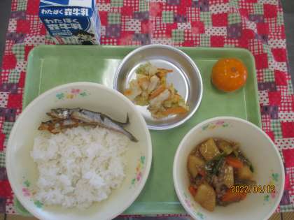 今日の給食は、ごはん やきししゃも じゃこいため ボイル野菜のごま醤油 れいとうミカン 牛乳です。