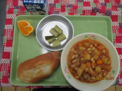 今日の給食は、ソフトフランスパン ポークビーンズ フレンチキュウリ きよみ 牛乳です。
