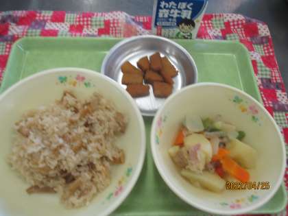 今日の給食は、たけのこごはん いかのまつかさに しおにくじゃが 牛乳です。