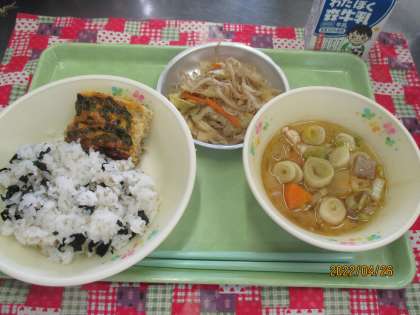 今日の給食は、わかめごはん 厚焼きたまご みそけんちん 野菜のおかか和え 牛乳です。