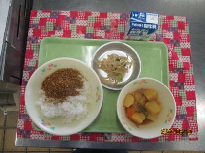 今日の給食は、ごはん ふりかけ 韓国風肉じゃが もやしの辛子和え 牛乳です。