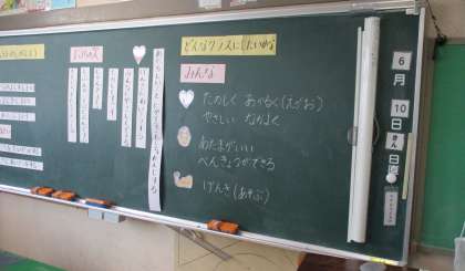 学級活動で学級目標を決めました。学校教育目標、1年生の学年目標、先生や保護者の方の「こんなクラスになってほしい。こんな子どもたちに育ってほしい。」という思い受けて話し合いをしました。短い言葉にまとまりましたが、色々な人の思いがつまっているということを子どもたちは感じとりました。