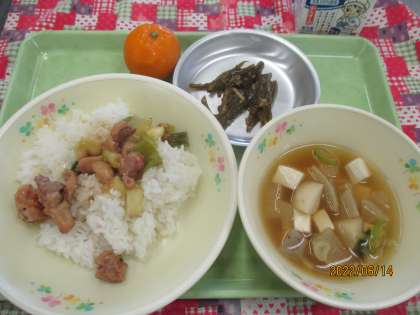 今日の給食は、やきとりどん けんちん汁 くきわかめのしょうがいため れいとうミカン 牛乳です。