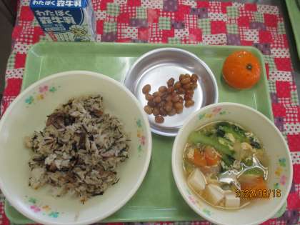 今日の給食は、ひじきごはん ぶどうまめ かきたま汁 れいとうミカン 牛乳です。