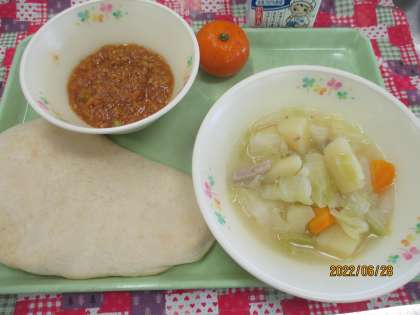 今日の給食は、ナン キーマカレー 野菜のスープ煮 れいとうミカン 牛乳です。