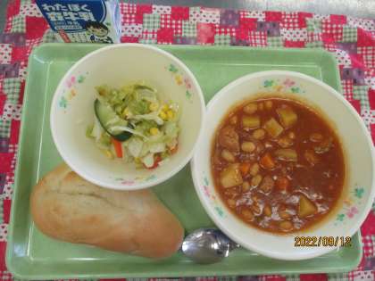 今日の給食は、ソフトフランスパン ポークビーンズ カラフルサラダ 牛乳です。