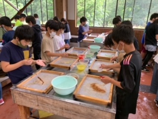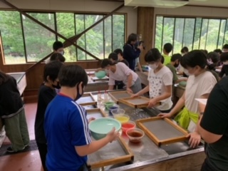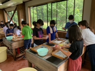 まずは、うちわの骨組みを、和紙の原料で挟み込むところから始まり、絵付へと作業を進めています。