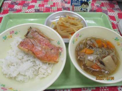 今日の給食は、麦ご飯 小田原金目鯛干物焼き じゃがいものきんぴら さわにわん 牛乳です。