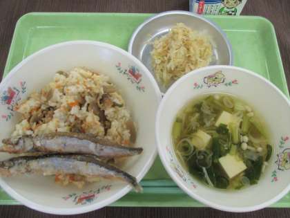 とりごぼうごはん・ししゃものから揚げ・すまし汁・梅おかかキャベツ・牛乳