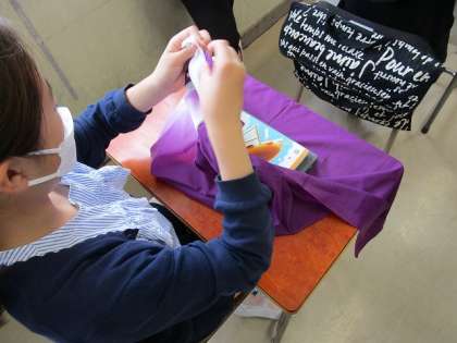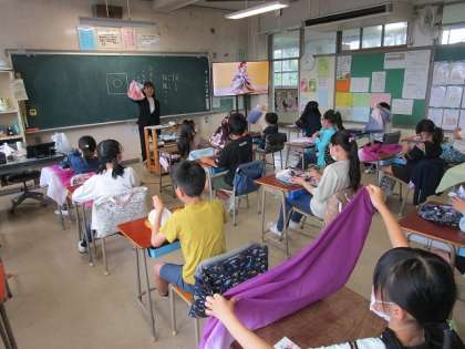 その中で、風呂敷を実際に使って、様々なものを包む体験をしました。体験を通して、「様々なものを包むことができる。」「いろいろな柄があって、きれい。」「手触りが気持ちいい。」などに気付くことができました。
