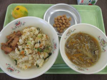 にんじんごはん・いかのみそ炒め・沢煮椀・ぶどう豆・果物(みかん)・牛乳