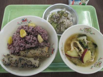 秋月ごはん・石垣揚げ・八王汁・ゆかり和え・牛乳
