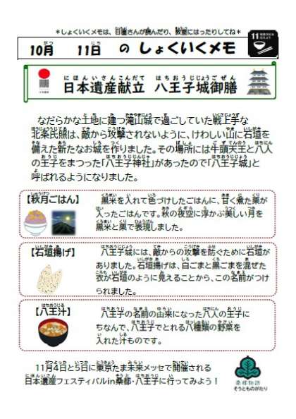 「日本遺産フェスティバルin桑都・八王子」の開催に向けて、学校給食では日本遺産献立が登場します。
