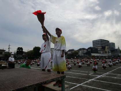 代表児童の聖火点火で、横二小の運動会が始まりました!今年の6年生の聖火ランナーは中央昇降口に展示してあった「TOKYO2020」のウェアを着ての登場でした。この後、繰り広げられる児童の雄姿に期待が高まります。